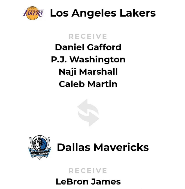 洛杉矶湖人得到:丹尼尔·加福德、P.J. 华盛顿、纳吉·马歇尔、 卡莱布·马丁;达拉斯独行侠得到:勒布朗·詹姆斯